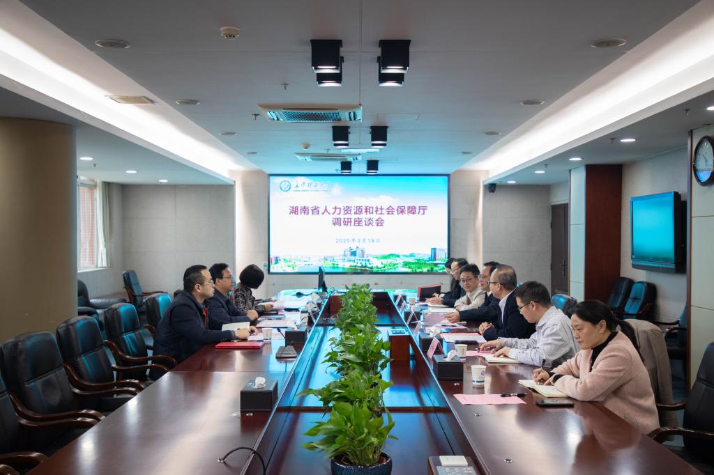 3月18日上午,湖南省人力资源和社会保障厅党组成员、副厅长周光明一行来校调研指导工作。校党委委员、副校长刘朝晖出席调研座谈会。湖南省人力资源和社会保障厅专业技术人员管理处负责人陪同调研,校人事处和继续教育学院主要负责人、专家代表参加调研座谈会。