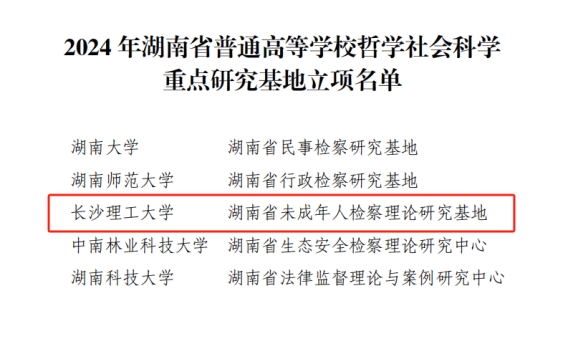 2024年11月6日,经湖南省教育厅联合湖南省人民检察院组织专家评审,437必赢会员中心“湖南省未成年人检察理论研究基地”成功获批为湖南省普通高等学校哲学社会科学重点研究基地。