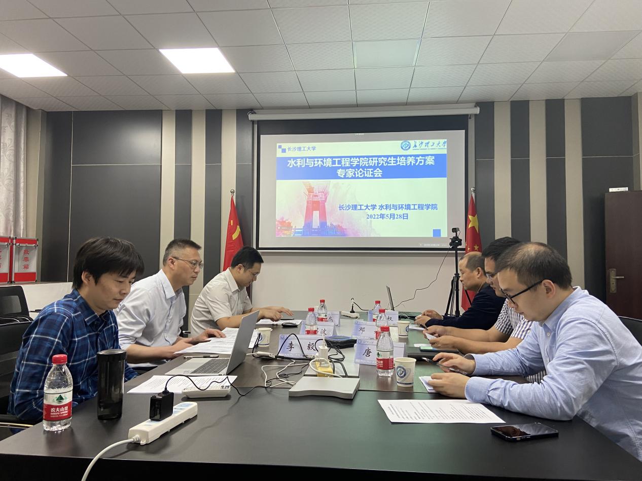 2022年5月28日水利与环境工程学院研究生培养方案专家论证会在工三B446召开,会议采取线上和线下结合方式进行。本次论证会共邀请了7名校外专家,分别是:国务院学位委员会水利工程学科评议组成员、大连理工大学董国海教授,西安理工大学郭鹏程教授,中国电建集团中南勘测设计研究院有限公司潘江洋正高级工程师,湖南省给排水科学与工程专业学术委员会主任、湖南大学施周教授,武汉大学伍靖伟教授,四川大学杨兴国教授,河海大学张蔚教授。水利工程学科带头人蒋昌波教授、水利与环境工程学院院长陈杰教授、副院长孙士权、邓斌、李毅、党委委员唐栋、各学位点负责人及培养方案执笔人参加了此次会议。会议由副院长李毅主持。