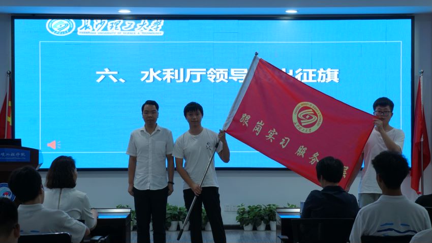 湖南省水利厅人事处郑东科长授出征旗,出征授旗仪式的举行标志着跟岗实习的号角正式吹响。彭承长同学带领全体水利特岗生宣誓,洪亮的声音、饱满的热情、坚定的眼神,表达了水利特岗生们圆满完成跟岗实习的决心。