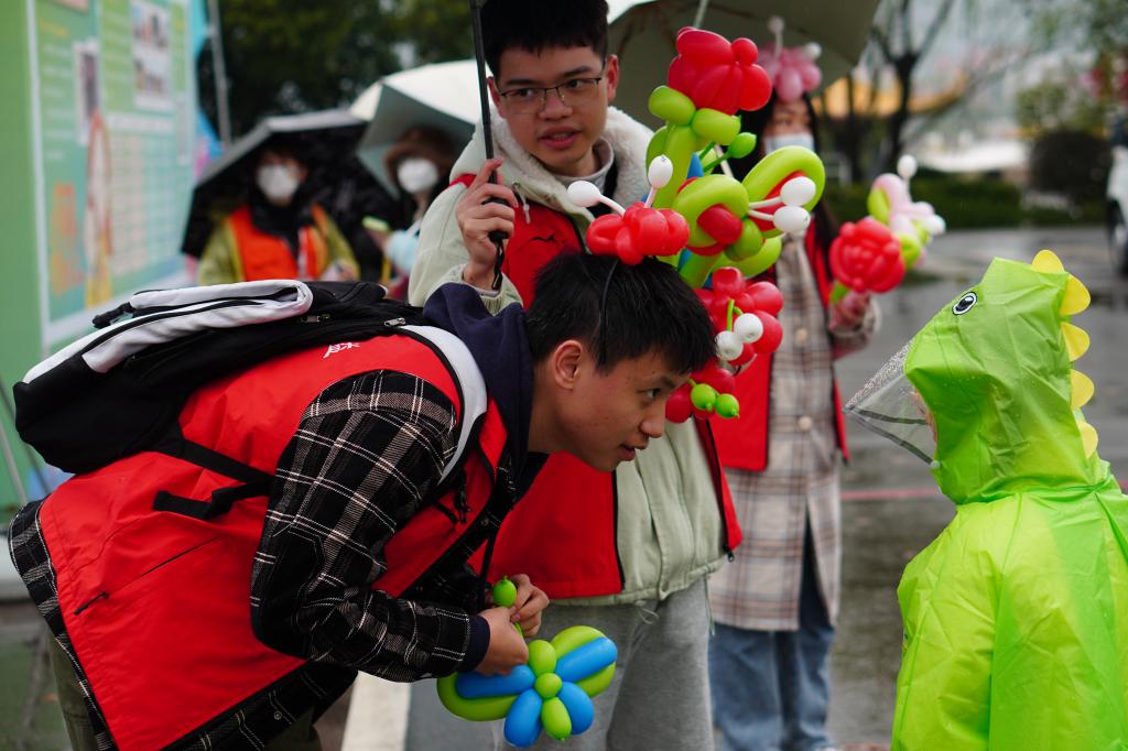 水文特岗班联合长沙市雨花区“美人鱼”公益服务中心帮助残障人士创业创收,活动现场细雨绵绵,水文特岗生的热情不减分毫。他们纷纷穿上红马甲,手捧气球花朵和手工艺品,积极为来往的爱心人士宣传介绍“美人鱼”公益组织,讲述每一个手工艺品背后残友们坚强的意志和不屈的精神。随着义卖活动的帷幕正式拉开,现场瞬间沸腾起来,不少爱心人士三五成群来到摊位,精心挑选着心怡的物品,奉献一份暖暖的爱心。