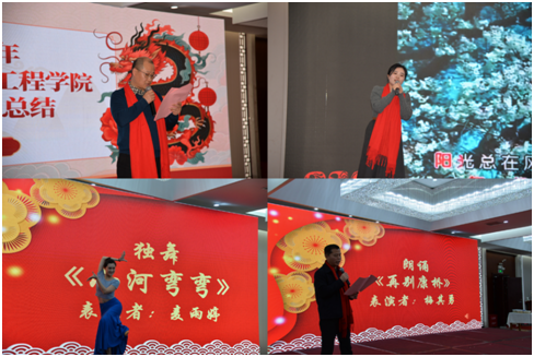 院工会主席孙士权做《水利与环境工程学院2023年度工会工作总结》、《水利与环境工程学院2023年度工会财务总结》报告。随后工会为全院教职工献上精彩的节目,给排水科学与工程系工会曹娇献上独唱《阳光总在风雨后》,行政工会麦雨婷表演独舞《小河弯弯》,水利水电工程工会梅其勇老师演唱《最美夕阳红》朗诵:再别康桥。