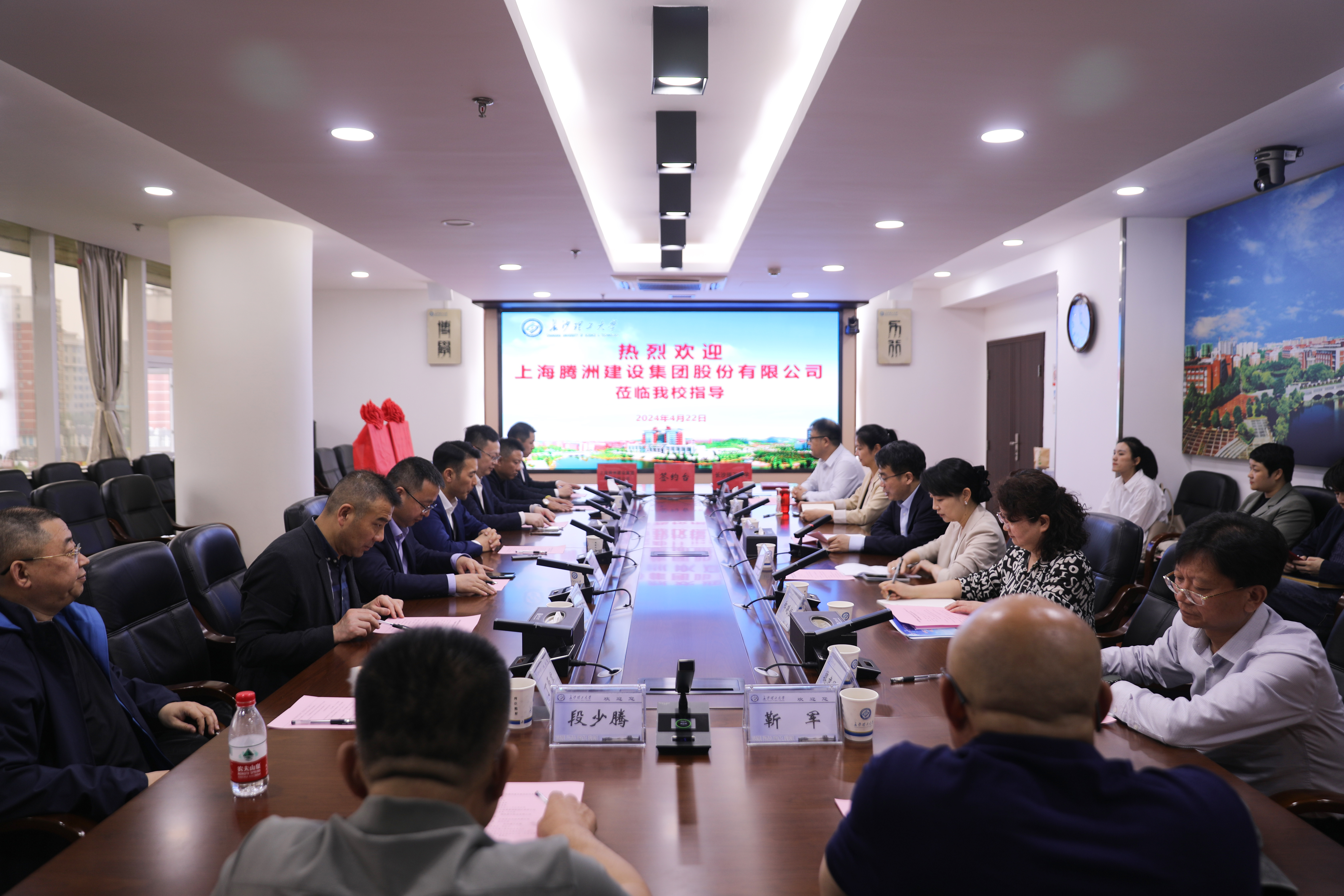4月22日,上海腾洲建设集团股份有限公司来校洽谈并与学校签署校企战略合作框架协议,双方在云塘校区一办公楼六会议室召开座谈会。上海腾洲建设集团股份有限公司董事长周昌海、总裁邓轩,学校党委委员、副校长钱国平出席,教务处、科技处、水利学院、校友中心、资产投资公司单位负责人参加座谈。