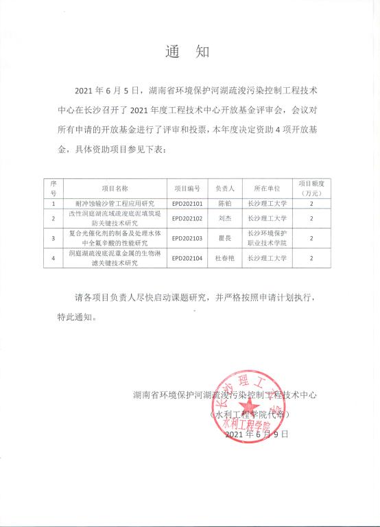 2021年度湖南省环境保护河湖疏浚污染控制工程技术开放基金立项通知
