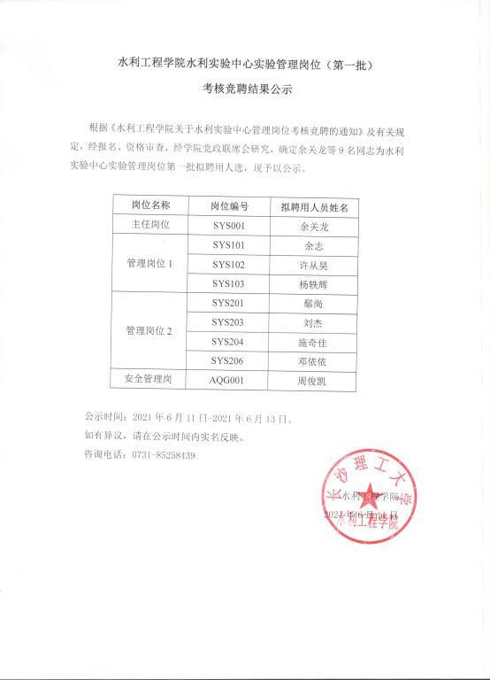 水利工程学院水利实验中心试验管理岗位(第一批)考核竞聘结果公示