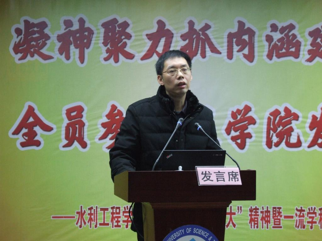 副院长程永舟做“强自信,补短板,鼓干劲,造学科高峰——水利工程学院学科和科研情况分析”报告,介绍了第四轮学科评估情况,对学院的科研情况进行了详细的剖析,并对学科发展提出了具体的建议。副院长蒋中明做“建设多层次科研团队,推动科技工作持续发展——关于水利工程学院科研团队建设思考”报告,阐述了科研团队建设的必要性,深刻剖析了学院科研团队 的现状,指出了学院“科研团队”运行存在的问题,并给出了科研团队建设的建议。教授代表张贵金做“人人贡献力量,铺就水利工程学科建设新台阶”报告,从教授角度出发,阐述了大力推进水利工程学科建设的必要条件,分析了水利工程学科发展现状,对今后的学科建设工程提出了建议。青年教师代表姚宇做“促进青年教师成长,把握学院发展未来”报告,详细分析了学院青年教师的基本情况,剖析了制约青年教师科研发展的因素,汇总提出了学院青年教师们对学科专业发展的建议。