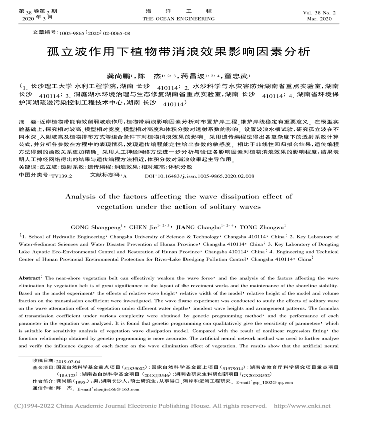 近日,CSCD核心期刊《海洋工程》公布了2020年度优秀论文评选结果,其中我院2017级硕士研究生龚尚鹏为第一作者发表的学术论文孤立波作用下植物带消浪效果影响因素分析成功入选。