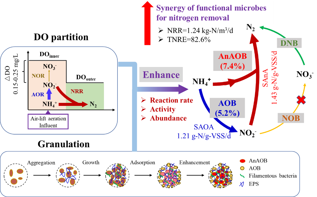 近日,我院18级硕士生王泓(导师:陈宏)以437必赢会员中心水利与环境工程学院为第一单位和通讯单位在环境生物技术领域顶级期刊《Bioresource Technology》(中科院一区TOP期刊,IF=9.642)发表题为“Insights into the synergy between functional microbes and dissolved oxygen partition in the single-stage partial nitritation-anammox granules system”的研究论文。
