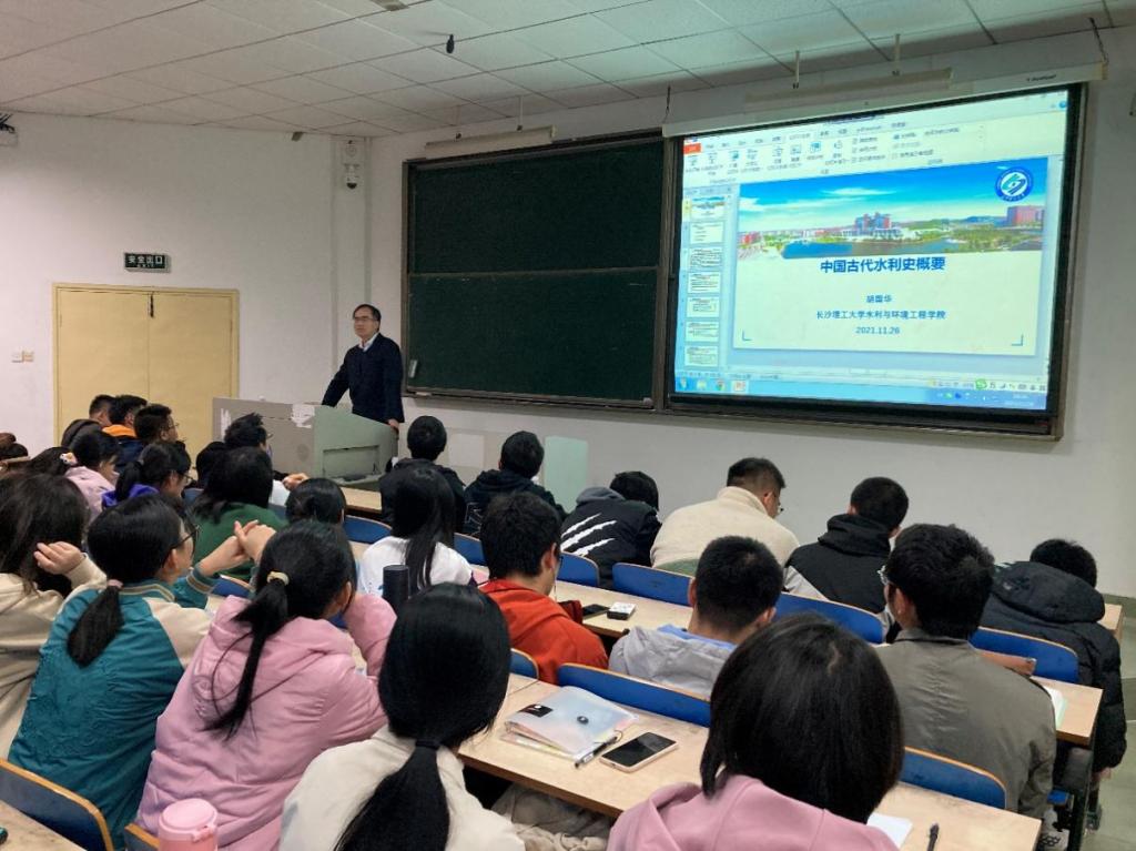 为提高2021级新生对所学专业的认识,加深对专业的了解, 11月26日晚,水利与环境工程学院在金盆岭校区6教207举办以“中国古代水利史概要”为主题的通识教育讲座,主讲人为水利与环境工程学院水文与水资源工程系胡国华教授,讲座现场座无虚席,气氛热烈。