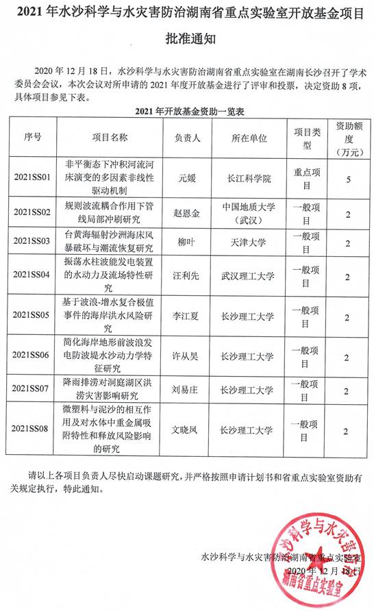 2021年水沙科学与水灾害防治湖南省重点实验室开放基金项目批准通知