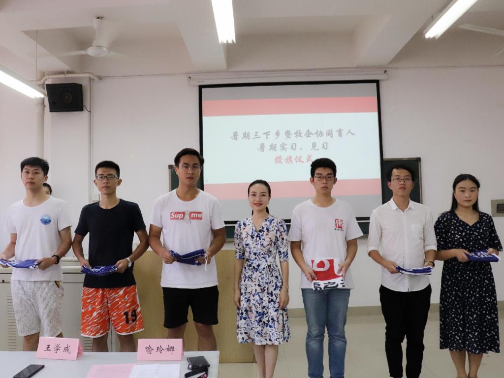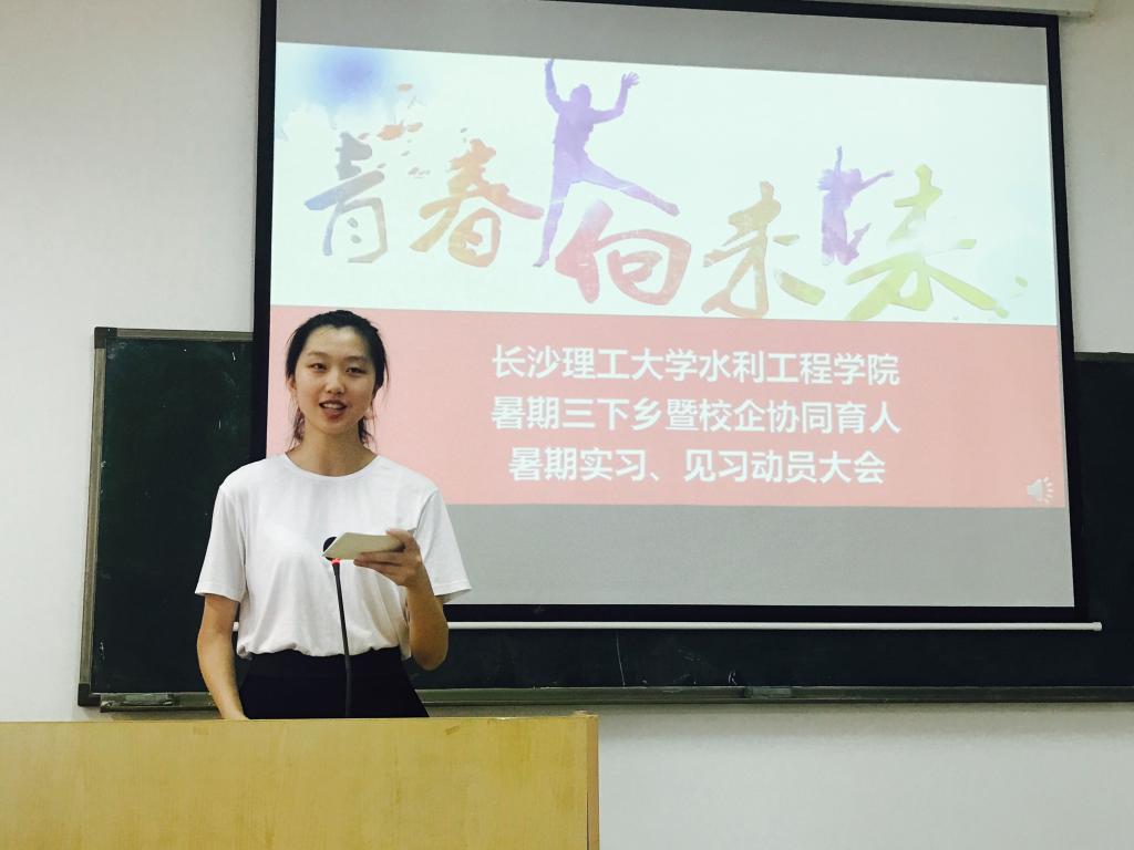 首先院团委书记杜丘宣读了《关于开展水利工程学院2018年暑期“三下乡”社会实践活动的通知》。水利工程学院2018年暑期社会实践开展“一十百千”工程,围绕一个主题——洞庭湖保护与河长制推行,十名专业老师全程指导,百个重点团队同时开展,千人实践受益,让实践成为学生成长成才的重要抓手并在安全教育、实践宣传、全员参与等方面提出了要求。随后校企协同育人暑期实习、见习代表陆佳俊与暑期三下乡社会实践团队代表杨锦岩发言。他们对于学院提供的机会表示感谢并表示在实践过程中严守纪律,以保障安全为第一要务,沉下心,迈稳步,勤钻研,秉承“源洁而流清 行端则影直”的水利人精神,用青春与汗水谱写水利人的自豪与荣光。在《青年志愿者之歌》中,喻玲娜为实习、见习队伍授旗与社会实践团队授旗并讲话。 她指出社会实践与实习见习在成长中的重要作用并对实习实践队伍提出四点要求,希望他们用干劲、闯劲、钻劲投身社会实践,在实践中经风雨、见世面、受教育、长才干、做贡献。