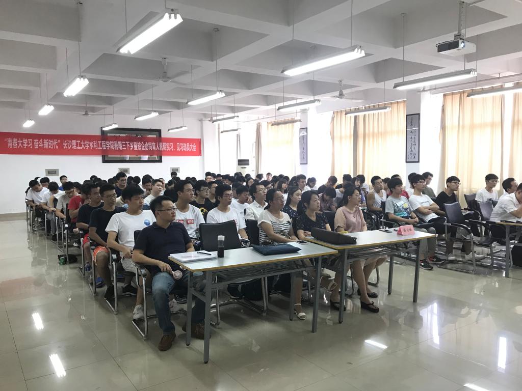 2018年7月11日9:30,水利工程学院在云塘校区工科三号楼B319举行“青春大学习 奋斗新时代”暑期三下乡暨校企协同育人暑期实习、见习动员大会。出席本次大会的领导有院党委书记喻玲娜、院党委副书记王学成、副院长韩时琳港航系专业教师夏波、孙鹰、王祖志,陈红萍、李雪淋以及向泰尚。三下乡团队代表、各支部团支书以及实习代表参加了本次会议。