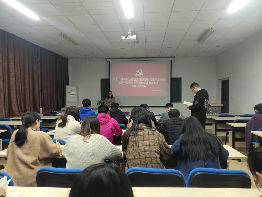 11月18日晚,水利工程学院2018级研究生直属党支部在水利馆A304围绕“习近平总书记对当代青年大学生成长成才重要论述”进行了主题研讨。党支部书记黄远发以及支部全体成员参加会议,支部副书记郭慧主持会议。