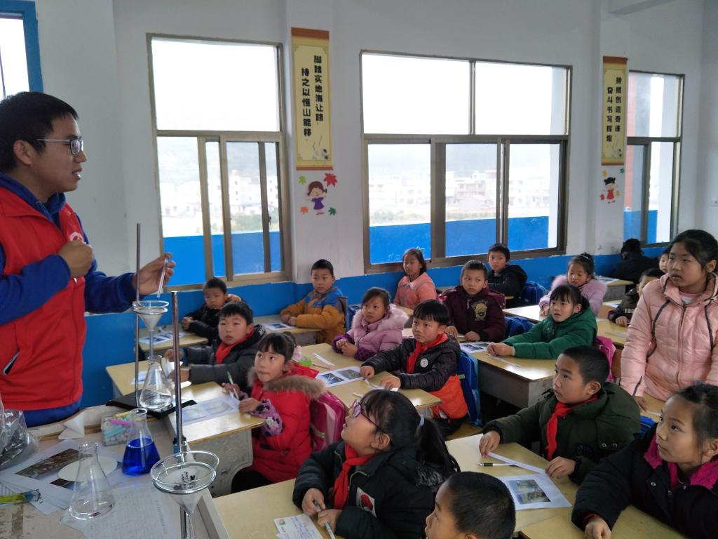 “经过滤纸和活性炭粉末过滤的脏水是不是变干净了呢!”,2019年12月30日下午,水利工程学院大禹之子青年志愿者协会的志愿者们走进邵阳市新宁县水庙镇中心小学,为同学们上了一堂生动的环保课。