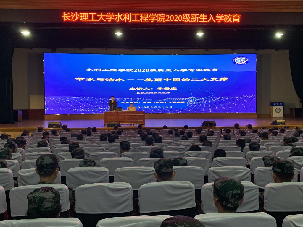 2020年9月26日上午10点,水利工程学院在金盆岭校区五教大会堂举行2020级新生入学教育主题讲座——“节水与洁水”美丽中国的两大支撑。本次讲座邀请中国水利学会教授级高级工程师李贵宝主讲,院党委副书记吴振华、副院长韩时琳以及2020级全体本科生与研究生新生参加。讲座由副院长蒋中明主持。
