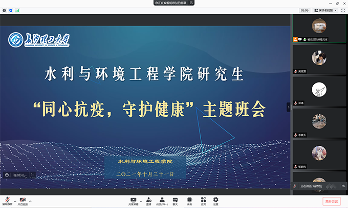 为加强疫情期间日常管理,切实加强疫情防控,细化防控措施,2021年10月31日晚7点,水利与环境工程学院研究生组织开展“同心抗疫,守护健康”主题班会。此次会议在腾讯会议上召开,研究生辅导员杜丘以及2019级、2020级全体研究生参加,会议由2020级班长杨恩喆主持。