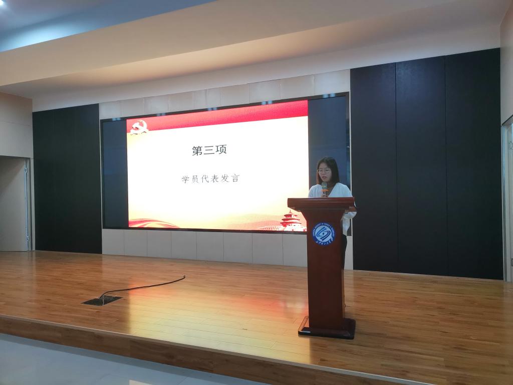 发展对象谭佳颖同学作为学员代表发言,表示将带头严守学员纪律、认真进行培训班课程学习,努力提升理论知识水平、接受培养考察,在实际中践行全心全意为人民服务宗旨。