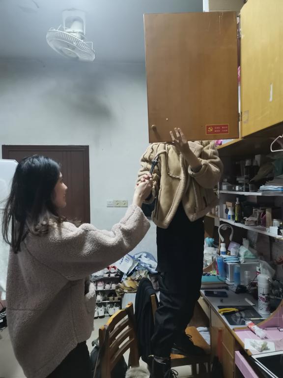 晚上10点,参与此次志愿维修服务的同志分为两组,分头行动,各自带着工具进到需要的寝室进行维修服务。帮助维修了裂开的衣柜、晃动的水管和掉落的墙纸、上床的楼梯和坏掉的门把手等。很多同学们因为我们支部的志愿维修服务感到温暖。