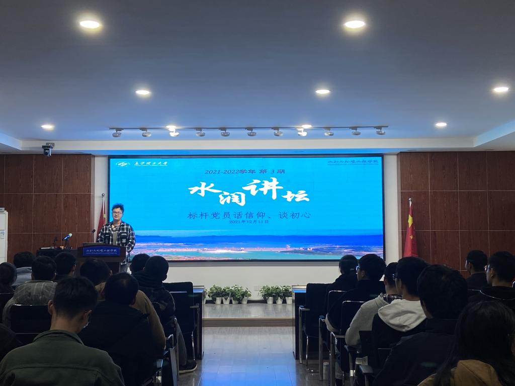为进一步强化和提升入党积极分子的党性修养,12月11日晚,水利与环境工程学院在云塘校区工科3号楼B319举办2021-2022学年第3期“水润讲坛”,主题为“标杆党员话信仰、谈初心”。本次活动由刘宇婷、张海林、孙绪波三位同学进行主讲,与80余名入党积极分子进行了深入交流。