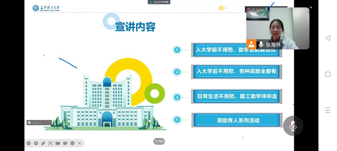 活动伊始,秦亮围绕“奖、贷、助、勤、免、补”全方位资助体系,着眼于入学前、入学后、日常生活三个方面,详细介绍了各项奖助类别和相关政策,帮助同学们全面了解学校资助体系。随后,秦亮详细解读了生源地助学贷款的申请流程和家庭经济困难学生的认定工作等,帮助有相关意向的同学了解相关问题。最后,她强调了受到资助后的诚信还款问题并鼓励同学们踊跃参与资助育人系列活动,争当国家资助政策的学习者、传播者和实践者。