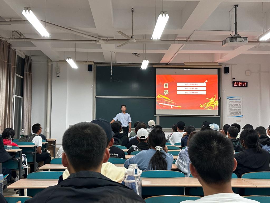 为确保新学年征兵宣传工作的顺利开展,进一步提升青年学子的国防意识和爱国情怀,增进对入伍政策的了解,水利学院于10月9日晚在工三B220教室举办主题为“火热军营,精彩人生”的入伍政策宣讲会。此次活动吸引了学院各年级超过100余名学生参与,由23级辅导员张海林老师主持。