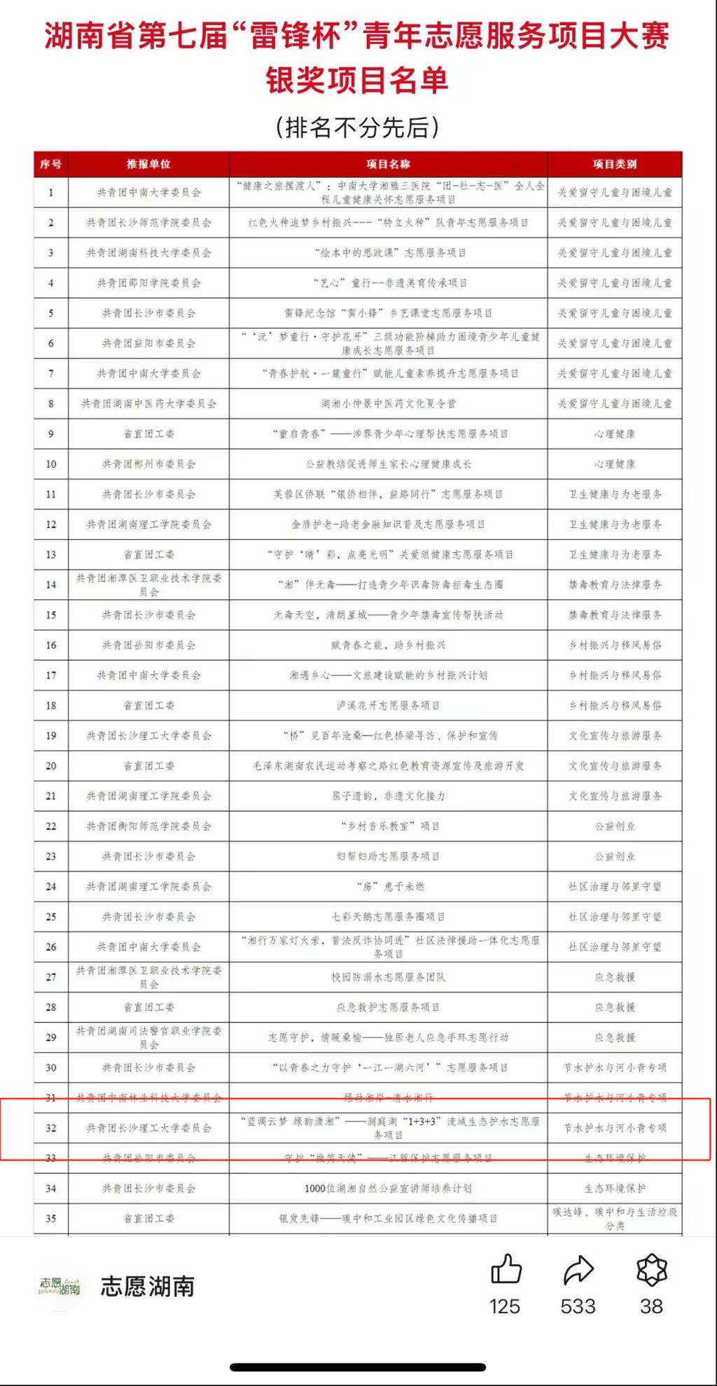 近日,湖南省第七届“雷锋杯”青年志愿服务项目大赛落下帷幕。其中,水利学院大禹之子青年志愿者协会“蓝调云梦 绿韵潇湘”——洞庭湖“1+3+3”流域生态护水志愿服务项目获得银奖。