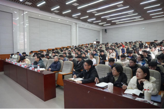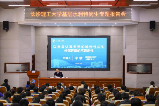 12月24日下午,学校在工科二号楼B301举行基层水利特岗生专题报告会,邀请湖南省水利厅人事处处长宋敏作专题报告。水利学院院长陈杰主持报告会,学院教师和辅导员代表、全体水利特岗生等200余人现场聆听报告。