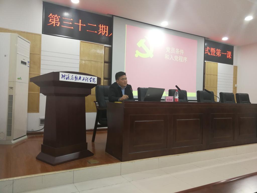 116日下午,水利工程学院分党校及能源与动力工程学院分党校合办的两院第32期学生积极分子培训班第一课在新能源2502教室如期开讲。本次课程主题为《党员条件和入党程序》,由能源与动力工程学院党委副书记杨雪峰讲授。
