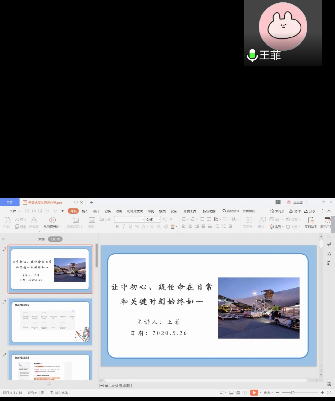 王菲同学分享了她在疫情发生后积极参与到志愿者团队为湖北前线医护人员寻找防护物资的经历。从1月24日开始,她便参与到整个团队的筹建和运转,进行物资寻找及鉴定、确定医院需求整理及对接联系、物流渠道确认等工作,同团队一起为湖北各大医院及医护人员筹集到大量的防疫物资。她说,疫情期间做志愿工作是党员责任担当的应有表现,今年是实现“两个一百年”奋斗目标的历史交汇之年,更需要我们青年学生党员担当有为,以青春之力跑出“加速度”,以无尽的朝气、厚实的底气,接过历史的接力棒,为实现中华民族伟大复兴作出新的贡献,不辜负这个伟大时代。