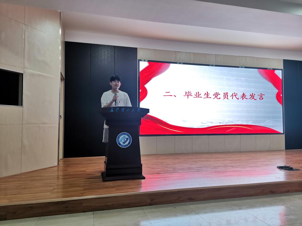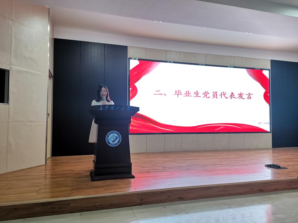 毕业生党员代表孙绪波、胡志慧进行发言,他们代表全体毕业生对向一直关心指导其成长的领导老师们致以深深的感谢,回顾了入党的初心和在组织培养下思想提升的历程,表示将不负母校的培养,肩负起时代赋予的使命,争做社会的栋梁。