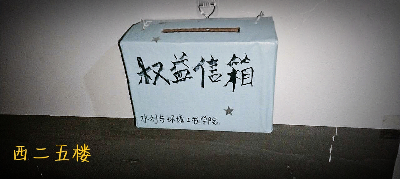 水利工程学院权益信箱由权益部制作设于金盆岭校区西苑二栋五楼楼梯口和西苑十一栋四楼大厅。权益部每月10日、20日和30日将会进行开箱,统筹同学们的普遍问题和意见,将收集到的问题整理分类,根据问题的性质和类别,第一时间与有关部门和老师取得联系,进行沟通、解决。