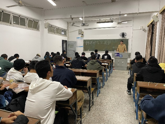 交流会开始,下班及各位优秀的学长、学姐上台进行经验分享,内容包括四六级备考、大学生活的适应、科研经验的分享等方面。