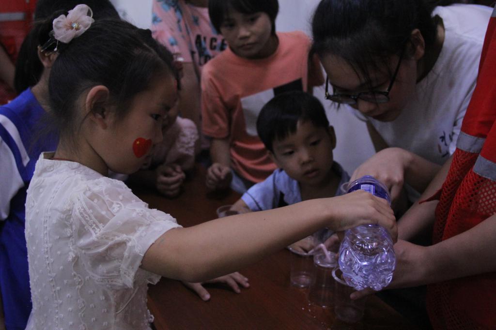 在课堂上,志愿者们还精心设计了参与性与展示型的实验,利用精心准备的虹吸实验简化装置对虹吸实验进行了演示。目不转睛的观察、全神贯注地倾听、小心翼翼的操作,孩子们兴致高昂地参与到实验当中,水在实验器材中瞬息变化,引来小朋友们一阵阵惊叹,课堂气氛十分热烈。实验结束后,志愿者对虹吸现象原理进行了细致讲解,向小朋友们介绍了虹吸现象在农田灌溉、排水系统等生产生活中的应用,孩子们感悟着水的魅力,加深了对虹吸现象的理解,体会到了科学的奇妙。