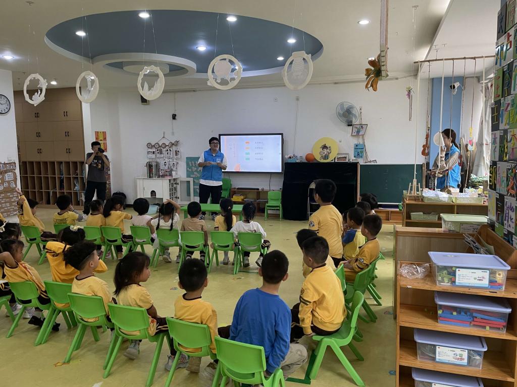 环保课堂上,志愿者给小朋友们朗诵了一篇名为《我是什么》的文章,引出了本次环保课堂的主题——保护水资源。周怡宁从水的特点、水的形态、水的作用以及如何节约用水四个方面介绍,让小朋友们对水资源有了全面的了解,学习了有用的节水小妙招。