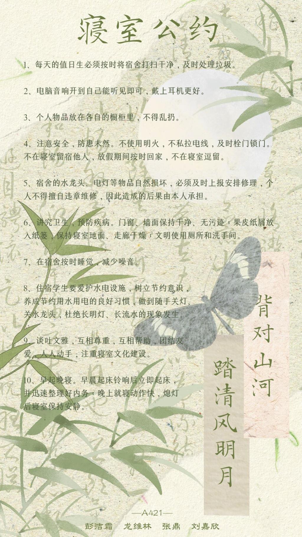 本次活动,参赛作品形式多样,各寝室以独特的方式打造公约作品,它们中有的独具匠心,“一见‘寝’心”海报,以幽默的方式传达他们的价值观;有的出乎意料,“寝室公约——201,别样的风景”以诗意的序言、舍徽寄寓寝室的初心与目标;以照片展现寝室成员的个性与宿舍的温馨......在各位同学的精心创作中,寝室成员增强了自信心、寝室归属感,共同为更好的、向往的寝室生活环境与温馨氛围做出自己的贡献。