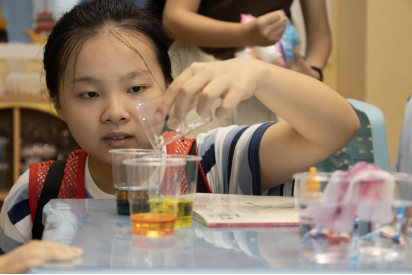 “彩虹塔桥”的实验中,志愿者将不同颜色的色素涂抹在纸巾的两端,中间留出一定距离,随后缓慢地将纸巾两端分别浸入两杯透明的水中。刹那间,如同彩虹般的色彩仿佛被架设了一座桥梁,彼此相连。孩子们睁大了眼睛,发出连续的惊叹声,并纷纷靠近仔细观察这一现象。