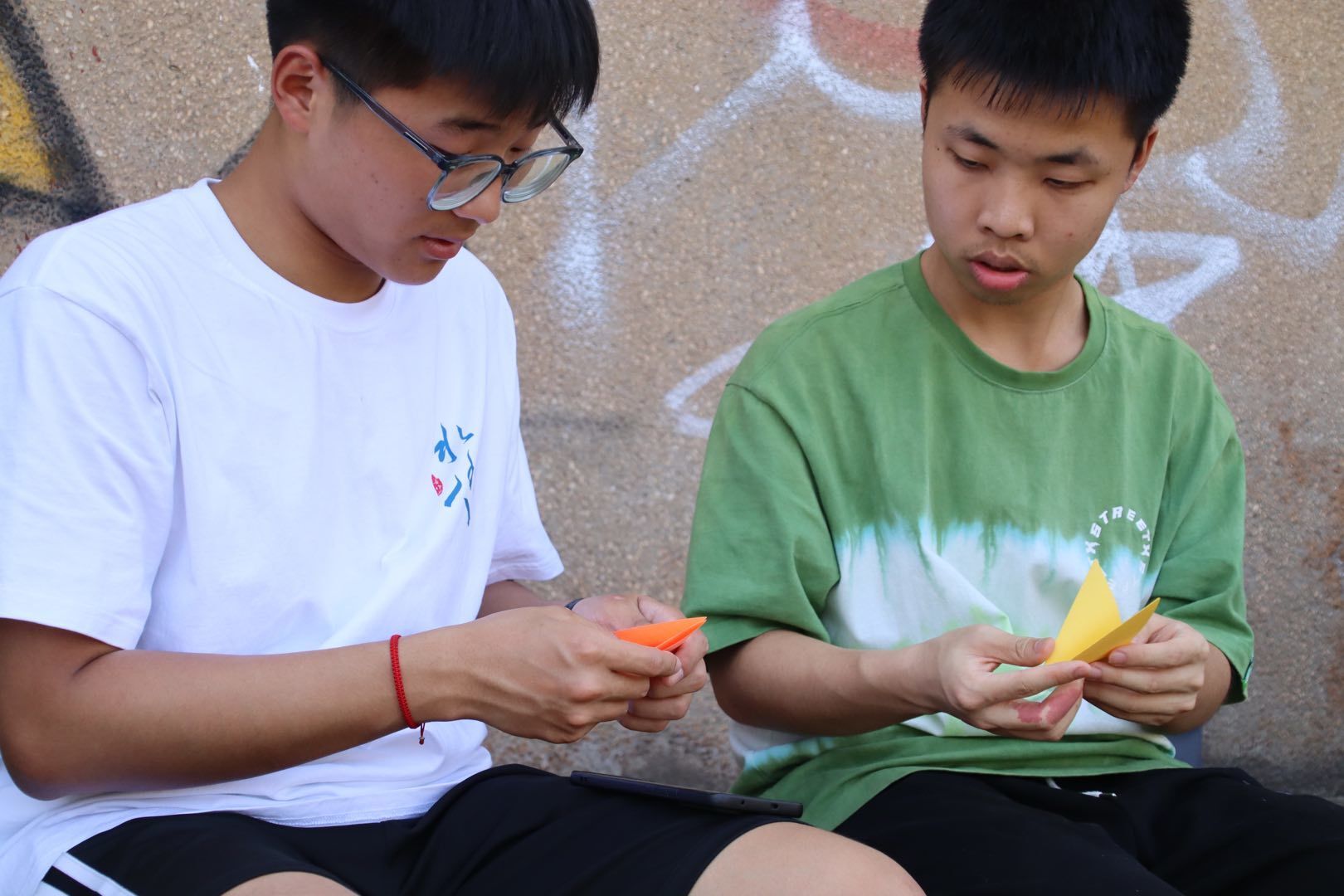本次风筝节活动以“牵手春天,放飞梦想”为主题,分为小游戏、DIY风筝、放飞风筝等3个环节,以四人小组为单位进行。活动伊始,是小游戏板块。小游戏板块又分为“童年纸飞机”、“吃饼干”两个环节。在“童年纸飞机”环节中,各小组相互“较劲”,仔细钻研,用彩纸折出各种不同种类的纸飞机,相互比赛那个小组的飞机飞的最远。在“吃饼干”环节中,同学们将饼干放在鼻子和眼睛中间,使尽浑身解数吃到饼干,动作滑稽可爱,活动现场欢声笑语不断。