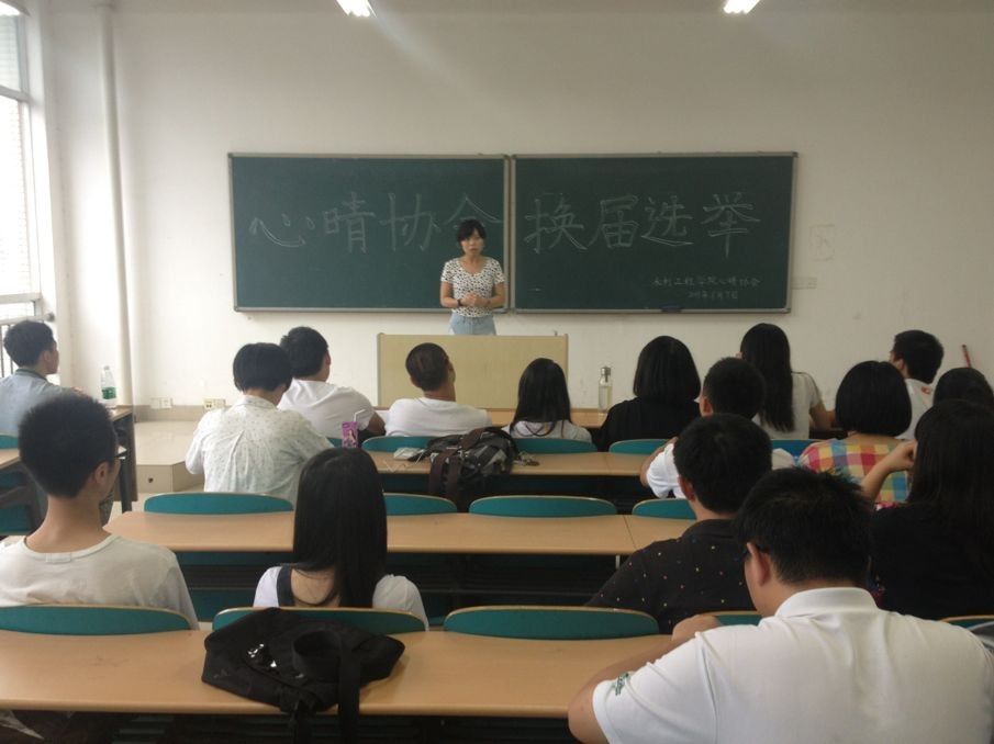5月27日,2013年水利学院心晴协会换届选举在工三A215举行,协会会长、副会长及各部成员参加了此次换届选举,院心理健康辅导员叶老师也出席此次选举。