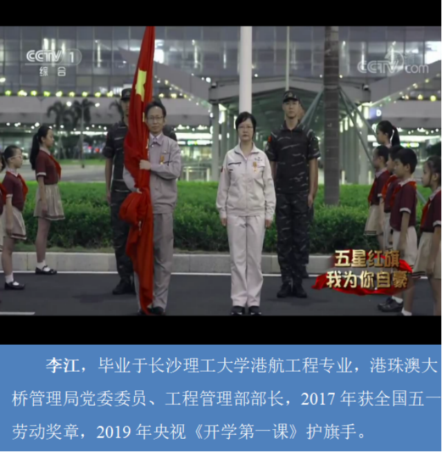 李江,毕业于437必赢会员中心港航工程专业,港珠澳大桥管理局党委委员、工程管理部部长,2017 年获全国五劳动奖章,2019 年央视《开学第一课》护旗手