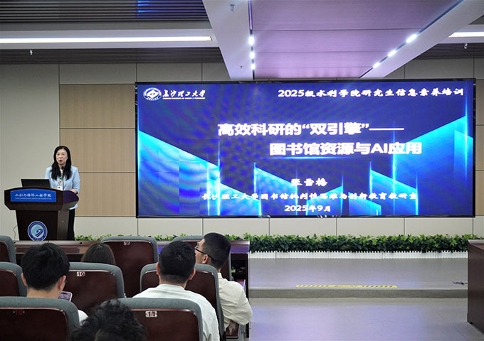 为进一步提升2025级研究生信息检索与学术资源利用能力,9月19日,水利学院在云塘校区新能源1栋二楼会议室开展主题为“高效科研的‘双引擎’——图书馆资源与AI应用”的第十七届研究生云影讲坛。本次讲座由湖南省高校数字图书馆副研究馆员、中国图书馆学会会员、教育部科技查新员张雪梅主讲,2025级全体研究生参加。