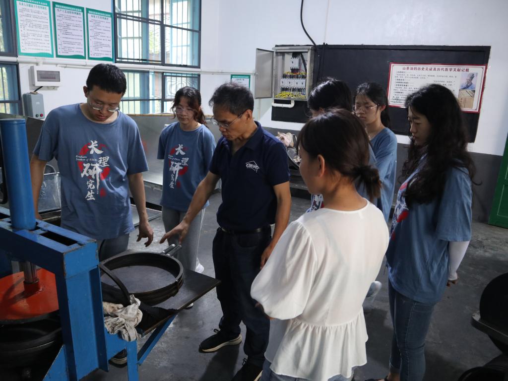 将油茶高值利用才能更好助力乡村振兴。实践团前往浏阳市张坊镇回农村生态油坊,寻找茶籽油生产的工艺密码。油坊经理谢秋平女士向大家介绍了茶油的生产工艺流程,“茶油的生产步骤包括了分选、烘干、粉碎、蒸胚、制饼、压榨、过滤、检测和灌装。”