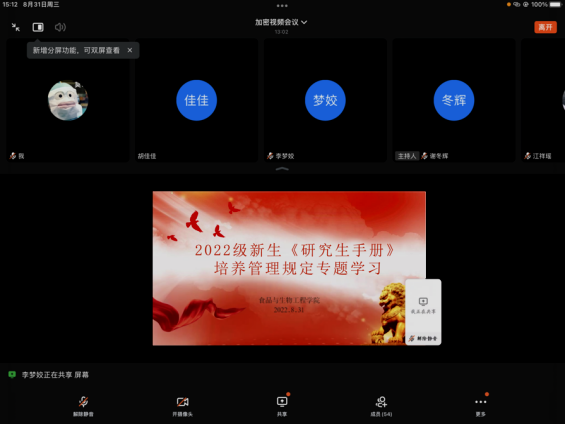 8月31日下午,食品学院举行了2022级研究生新生《研究生手册》学习大会,辅导员胡佳佳及全体研究生新生参加。