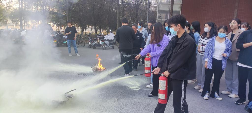 在安全知识培训后,部分师生参加了消防演习,了解了常见灭火器的类型及使用方法,并练习了干粉灭火器的正确操作方法。