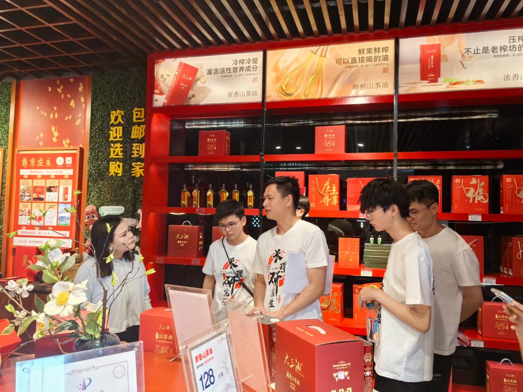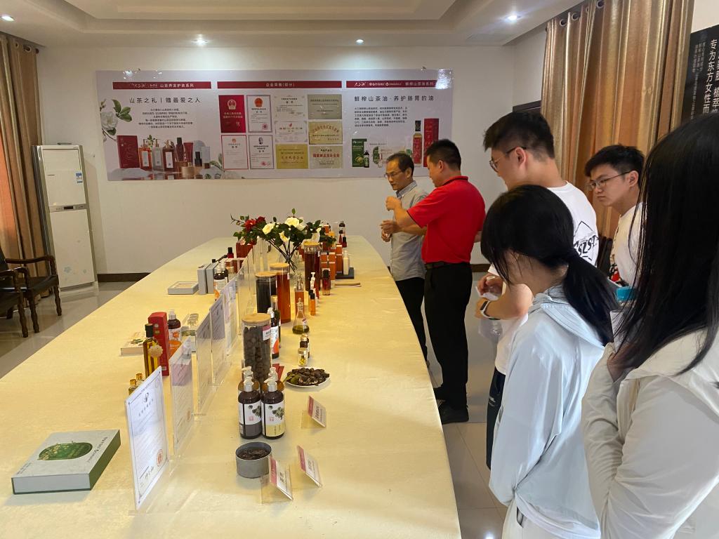 实践团深入衡阳油茶产业链核心环节展开沉浸式学习。在油茶龙头企业湖南大三湘茶油股份有限公司,现代化的生产流程和严苛的质量控制体系令实践团成员们叹服。他们全程观摩油茶果从清洗、剥壳、压榨到精炼的蜕变,并就低温冷榨工艺优化、品质稳定性控制等关键技术与企业工程师深入探讨。大三湘在品牌塑造、市场开拓,尤其是“油茶+文旅”融合模式上的成功实践,为学子们提供了产业升级的生动教材。