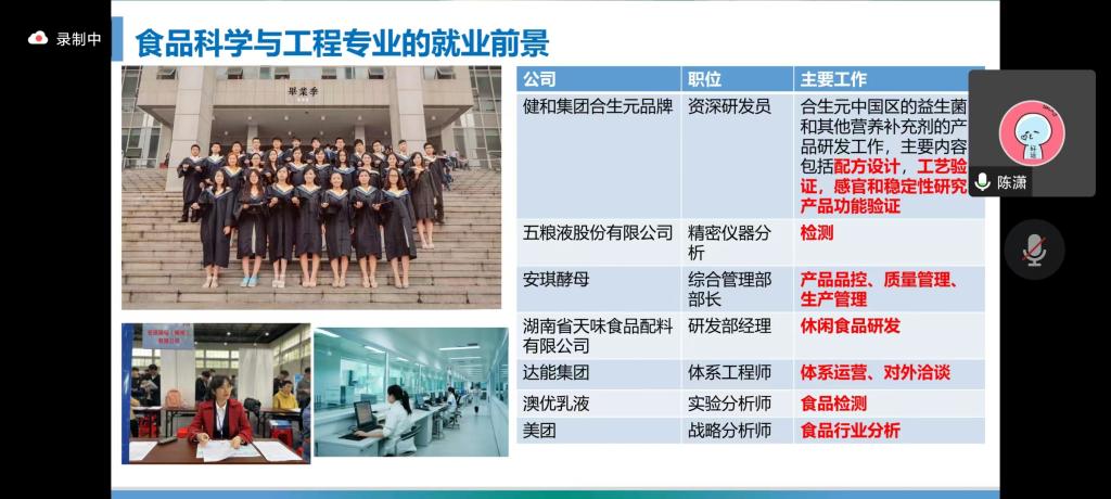 校友陈潇目前就职于南京农业大学食品科技学院。她为同学们介绍了她的学习生涯,重点介绍她本科阶段在长理度过的青葱岁月,并建议同学们本科期间要努力学习,为以后的科研工作打下坚实基础。
