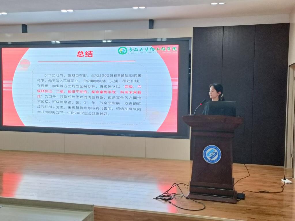 为建设优良的院风、班风、学风,促进同学们全方面发展,5月9日晚,食品学院于工三A307举行了2023年度“先进班集体”立项答辩会。辅导员王凤、食品党支部纪检委员黄紫璇、学院党总支部委员李湘娥、学生党总支群团党员周画棋、20级年级组长朱雅婷出席了本次活动,近100名学生代表现场观摩学习。