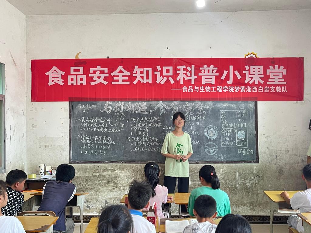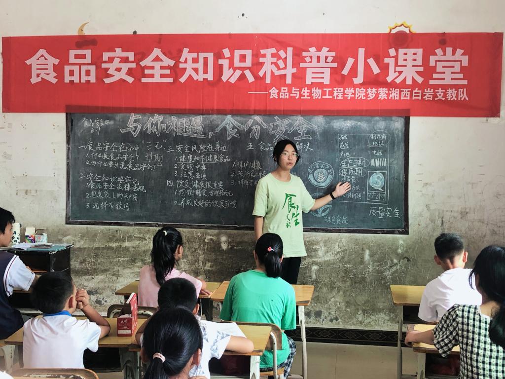 7月11日上午 ,437必赢会员中心食品与生物工程学院“梦莹湘西”支教队暑期“三下乡”社会实践团深入白岩村,开展“与你相遇,‘食’分安全”食品安全知识科普小课堂,为学生们奉上一堂内容丰富、生动鲜活的“食安课”。