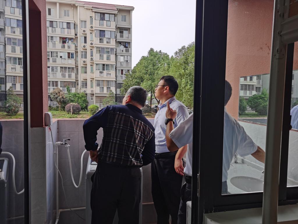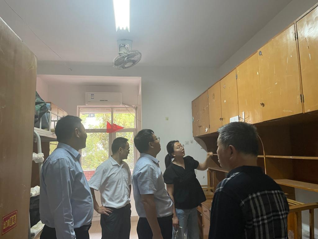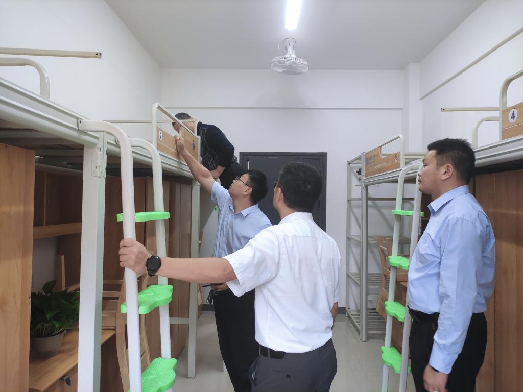 在新建成的敏行轩宿舍,王建辉一行实地查看了宿舍建设和房间家具配备情况,对宿舍是否还存在异味、床铺固定、宿舍卫生情况、安全防护问题等进行了细致检查。在女生集中入住的弘毅轩宿舍,王建辉一行认真查看记录个别宿舍存在的洗漱池发霉、衣柜门破损等细节问题,指出要尽快联系安排维修,确保新生入住前解决相关问题,为新生提供一个舒心的居住环境。
