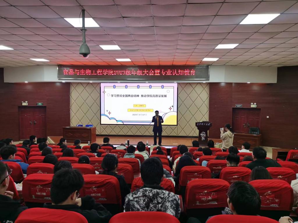 会议伊始,王建辉院长从学院概况、专业介绍、人才培养、科研前景等四个方面为同学们详细介绍了相关情况。并以预制菜产业发展情况、目前存在的问题以及如何通过食品、生物领域科研工作助力产业发展为例细致讲解了相关专业发展前景,同时寄语全体2023级学生能够深刻理解所学专业对于国计民生的重要性,潜心专业学习,锤炼科研精神。