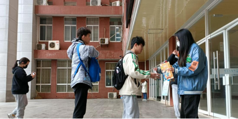 (图1 学生党员给没有佩戴口罩的学生发放口罩)
